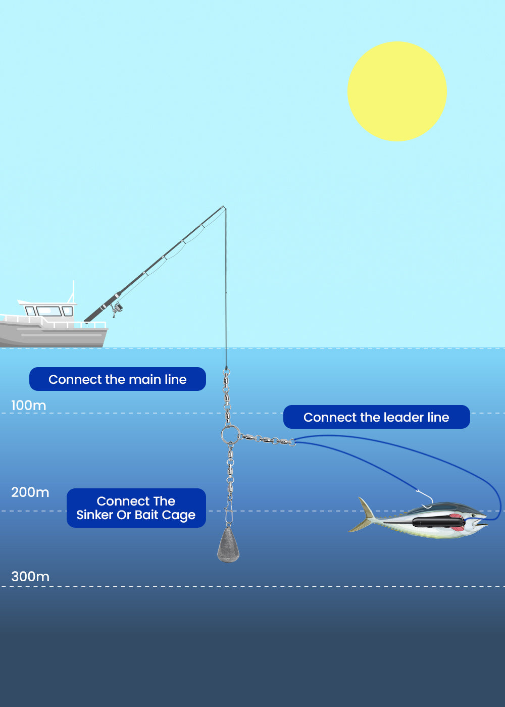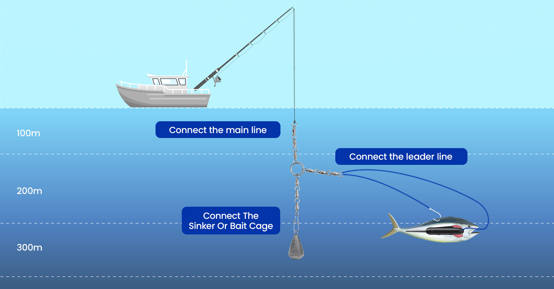 The main line from the fishing rod connects to a swivel that minimizes twisting. A snap link allows quick attachment of weights or bait cages. A leader line follows, offering strength and abrasion resistance, ending in a hook or lure to secure your bait. This setup enables quick adjustments and reliable performance.